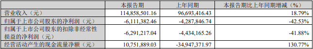2025年一季度报告显示,今年首季,公司实现营业收入1.15亿元,同比增长18.79%;归属于上市公司股东的净利润-611.14万元,上年同期为-428.78万元;归属于上市公司股东的扣除非经常性损益的净利润-629.12万元,上年同期为-443.42万元;经营活动产生的现金流量净额1075.19万元,上年同期为-3494.74万元。