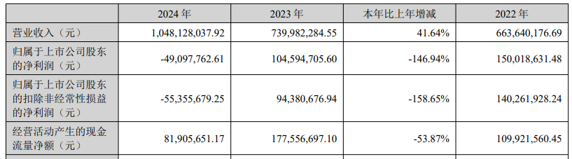 中国经济网北京6月27日讯 广联航空(300900.SZ)2024年年度报告显示,2024年,公司实现营业收入10.48亿元,同比增长41.64%;归属于上市公司股东的净利润-4909.78万元,上年同期1.05亿元;归属于上市公司股东的扣除非经常性损益的净利润-5535.57万元,上年同期9438.07万元;经营活动产生的现金流量净额为8190.57万元,同比下降53.87%。