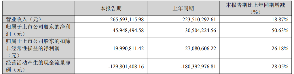 广联航空2025年一季度报告显示,报告期内,公司实现营业收入2.66亿元,同比增长18.87%;归属于上市公司股东的净利润4594.85万元,同比增长50.63%;归属于上市公司股东的扣除非经常性损益的净利润1999.08万元,同比下降26.18%;经营活动产生的现金流量净额为-1.30亿元,上年同期为-1.80亿元。