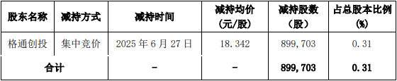 2025年6月27日,格通创投通过集中竞价方式,减持公司股票数量899,703股,占总股本比例0.31%,减持均价为18.342元/股,减持总金额为1650.24万元。