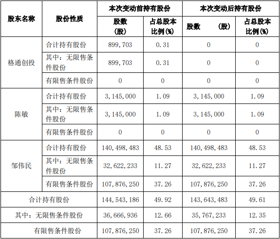 本次减持后,公司控股股东、实际控制人邹伟民、陈敏,及其一致行动人格通创投合计持有股份143,643,483股,占总股本比例49.61%。