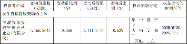 中国经济网北京7月2日讯 中谷物流(603565.SH)昨日晚间发布关于5%以上股东权益变动触及5%整数倍的提示性公告。公司收到股东宁波谷泽投资管理合伙企业(有限合伙)(以下简称“谷泽投资”)出具的《关于股份减持进展的告知函》,谷泽投资于2025年6月30日至2025年7月1日通过上海证券交易所系统以集中竞价方式减持公司股份439,400股,占公司总股本的0.02%,信息披露义务人及其一致行动人持股比例从65.02%减少至65.00%,其权益触及5%、1%整数倍。