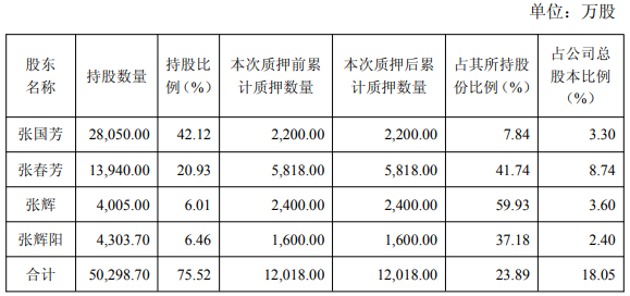 国芳集团2025年6月21日披露的关于控股股东一致行动人、实际控制人进行股票质押式回购交易展期的公告显示,截至公告披露日,张国芳、张春芳、张辉、张辉阳合计持股50,298.70万股,持股比例为75.52%;本次质押后累计质押数量为12,018.00万股,占其所持股份比例的23.89%,占公司总股本比例的18.05%。