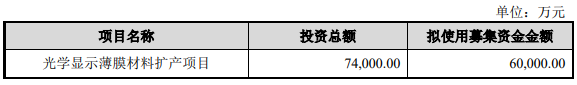 世华科技于2025年4月11日披露的募集说明书(申报稿)显示,本次发行的募集资金总额不超过60,000.00万元(含本数),扣除发行费用后的募集资金净额将用于以下项目:光学显示薄膜材料扩产项目。