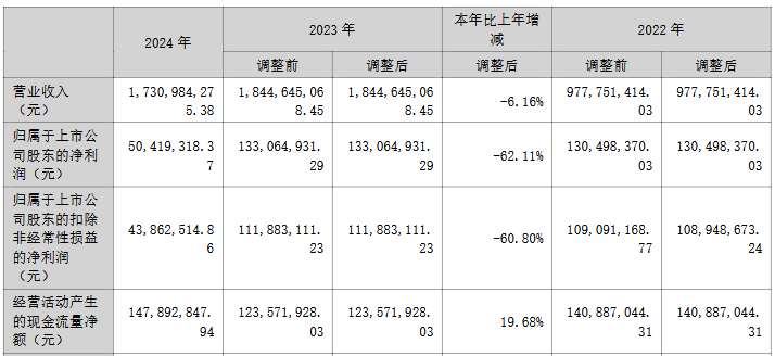 2024年,公司实现营业收入17.31亿元,同比下降6.16%;归属于上市公司股东的净利润为5,041.93万元,同比下降62.11%;归属于上市公司股东的扣除非经常性损益的净利润为4,386.25万元,同比下降60.80%;经营活动产生的现金流量净额为1.48亿元,同比增长19.68%。