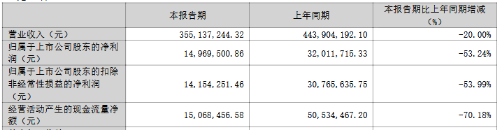 2025年1-3月,公司实现营业收入3.55亿元,同比下降20.00%;归属于上市公司股东的净利润为1,496.95万元,同比下降53.24%;归属于上市公司股东的扣除非经常性损益的净利润为1,415.43万元,同比下降53.99%;经营活动产生的现金流量净额为1,506.85万元,同比下降70.18%。