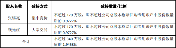 持有公司股份17,363,486.00股(占公司总股本9.81%)的控股股东一致行动人、董事钱光红计划自减持计划披露之日起15个交易日后的3个月内以大宗交易方式减持公司股份不超过170万股(占总股本剔除回购专用账户中股份数量后的0.9727%)。