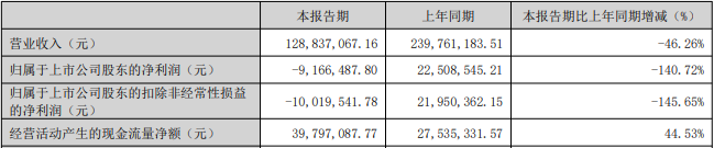 2025年一季度,公司实现营业收入1.29亿元,同比减少46.26%;归属于上市公司股东的净利润-916.65万元,同比减少140.72%;归属于上市公司股东的扣除非经常性损益的净利润-1001.95万元,同比减少145.65%;经营活动产生的现金流量净额3979.71万元,同比增长44.53%。