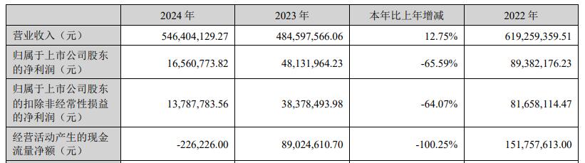 中国经济网北京7月6日讯 中科磁业(301141.SZ) 2024年年度报告显示,2024年,公司实现营业收入5.46亿元,同比增长12.75%;归属于上市公司股东的净利润1656.08万元,同比下降65.59%;归属于上市公司股东的扣除非经常性损益的净利润1378.78万元,同比下降64.07%;经营活动产生的现金流量净额为-22.62万元,上年同期为8902.46万元。