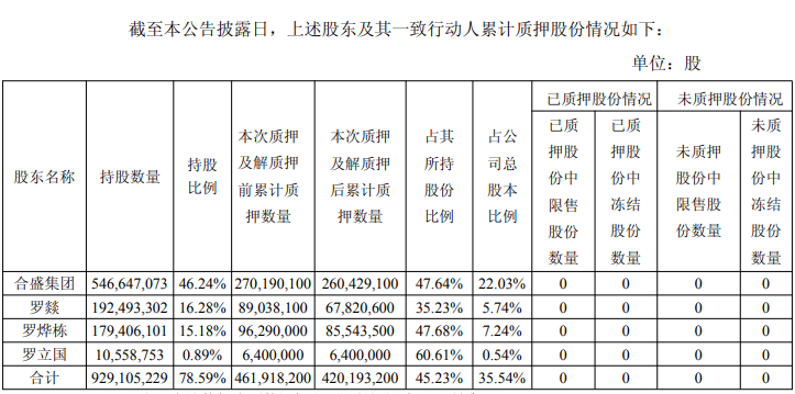 截至公告日,合盛集团及其一致行动人罗立国、罗燚、罗烨栋合计直接持有公司股份929,105,229股,占公司总股本的78.59%。本次质押及解质押后,合盛集团及其一致行动人罗立国、罗燚、罗烨栋直接持有的公司股份中处于质押状态的股份累计数为420,193,200股,占其合计所持公司股份总数的45.23%,占公司总股本的35.54%。