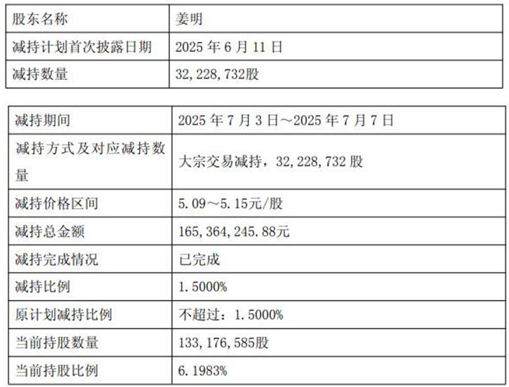 岱美股份公告显示,2025年7月3日至2025年7月7日,姜明通过大宗交易减持32,228,732股,减持价格区间5.09元/股至5.15元/股,减持总金额165,364,245.88元。