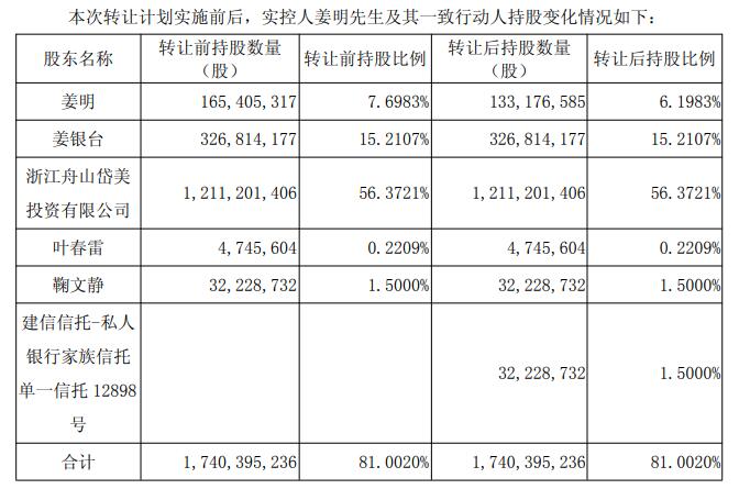 本次转让股份计划实施前,岱美股份实际控制人之一姜明持有公司股份165,405,317股,占转让股份计划实施前公司股份总数的比例为7.6983%。