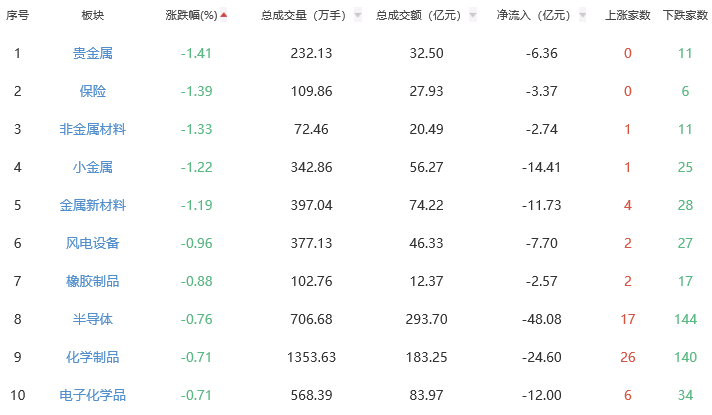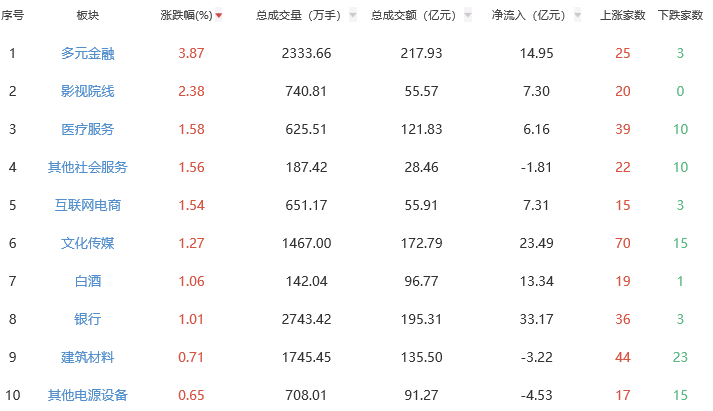 板块方面,多元金融、影视院线、医疗服务等板块涨幅居前,贵金属、保险、非金属材料等板块跌幅居前。