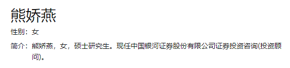 同花顺资料显示,熊娇燕为中国银河证券股份有限公司(简称“中国银河”,601881.SH)投资顾问。