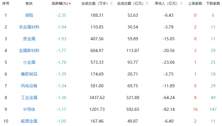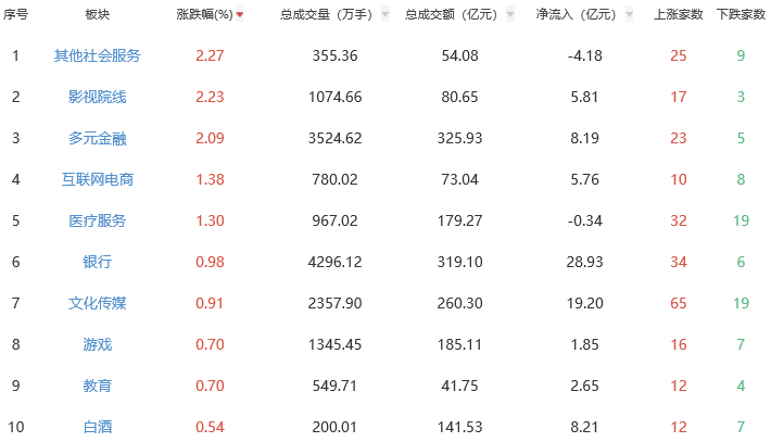 板块方面,其他社会服务、影视院线、多元金融等板块涨幅居前,保险、非金属材料、贵金属等板块跌幅居前。