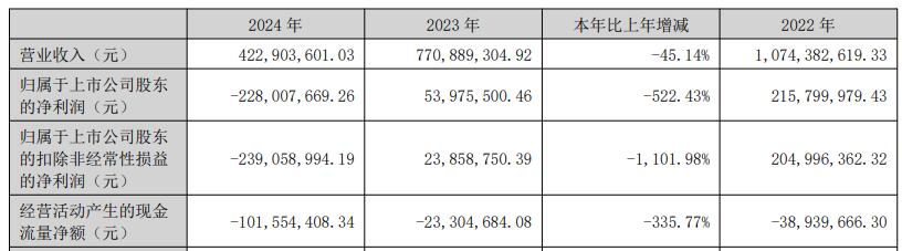 2024年,星网宇达实现营业收入4.23亿元,同比下降45.14%;归属于上市公司股东的净利润-2.28亿元,上年同期为5397.55万元;归属于上市公司股东的扣除非经常性损益的净利润-2.39亿元,上年同期为2385.88万元;经营活动产生的现金流量净额为-1.02亿元,上年同期为-2330.47万元。