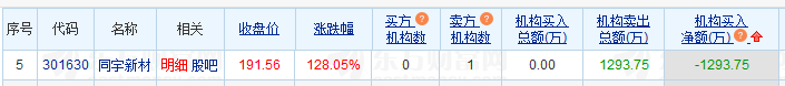同宇新材龙虎榜:1家机构进卖出前5 净卖出共1294万元