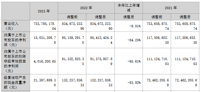 2020年至2023年,公司营业收入分别为7.06亿元、7.54亿元、8.35亿元、7.53亿元,归属于上市公司股东的净利润分别为1.44亿元、1.18亿元、0.95亿元、0.15亿元,归属于上市公司股东的扣除非经常性损益的净利润分别为1.46亿元、1.11亿元、0.92亿元、0.04亿元,经营活动产生的现金流量净额分别为1.58亿元、0.72亿元、1.32亿元、0.21亿元。