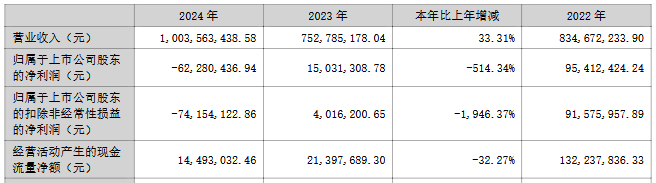 2024年,公司实现营业收入10.04亿元,同比增长33.31%;归属于上市公司股东的净利润为-6,228.04万元,上年同期为1,503.13万元;归属于上市公司股东的扣除非经常性损益的净利润为-7,415.41万元,上年同期为401.62万元;经营活动产生的现金流量净额为1,449.30万元,同比下降32.27%。