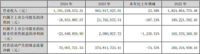 2024年,公司实现营业收入11.91亿元,同比增长23.58%;归属于上市公司股东的净利润-1893.39万元,同比减少187.24%;归属于上市公司股东的扣除非经常性损益的净利润-2364.89万元,同比减少1,236.51%;经营活动产生的现金流量净额7000.77万元,同比减少74.53%。