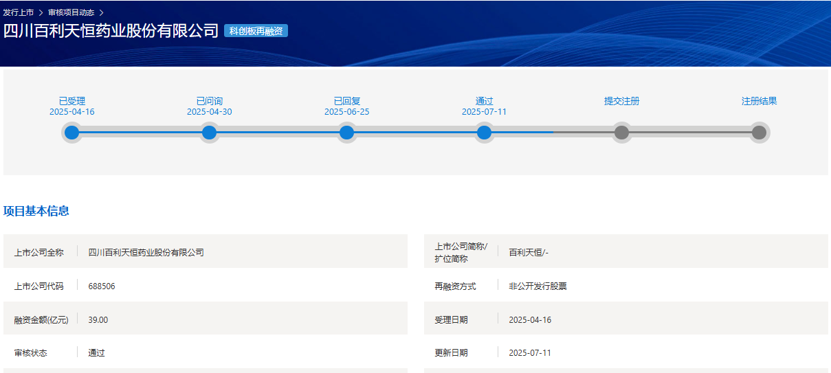 中国经济网北京7月13日讯 上交所网站近日更新信息显示,四川百利天恒药业股份有限公司(简称“百利天恒”,688506.SH)非公开发行股票审核状态为通过。