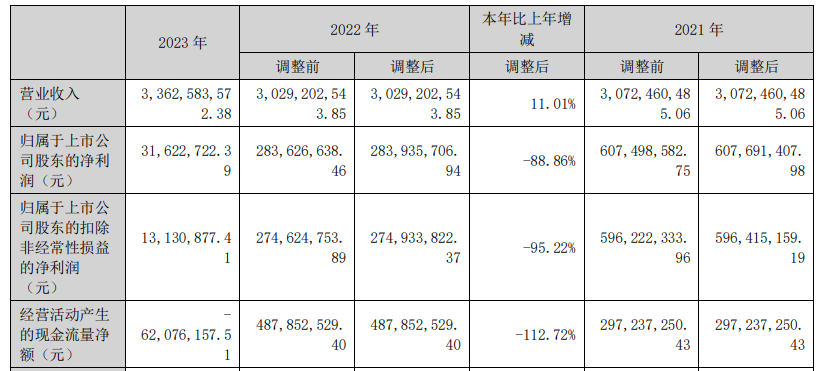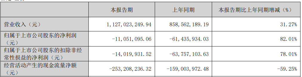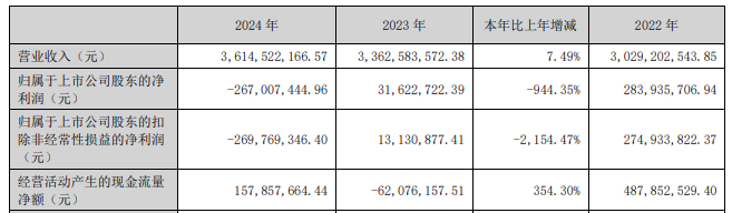 2024年年度报告显示,报告期内,公司实现营业总收入36.15亿元,同比增长7.49%;归属于上市公司股东的净利润-2.67亿元,同比减少944.35%;归属于上市公司股东的扣除非经常性损益的净利润-2.70亿元,同比减少2154.47%;经营活动产生的现金流量净额1.58亿元,同比增长354.30%。