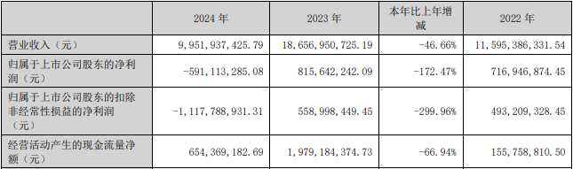 2024年,钧达股份实现营业收入99.52亿元,同比减少46.66%;归属于上市公司股东的净利润-5.91亿元,同比减少172.47%;归属于上市公司股东的扣除非经常性损益的净利润-11.18亿元,同比减少299.96%;经营活动产生的现金流量净额6.54亿元,同比减少66.94%。