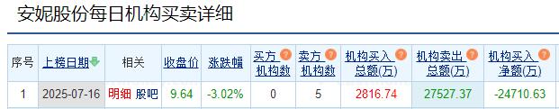 安妮股份龙虎榜:机构包揽卖出前5 净卖出共2.47亿元