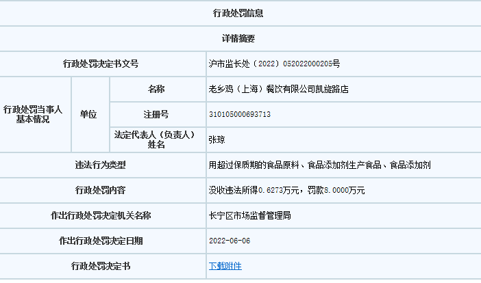 其中,2022年6月,老乡鸡(上海)餐饮有限公司凯旋路店因用超过保质期的食品原料、食品添加剂生产食品、食品添加剂,被长宁区市场监督管理局没收违法所得0.6273万元,罚款8万元。