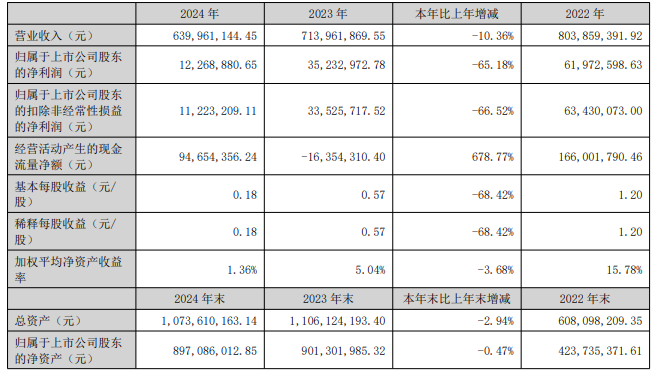 翔腾新材2024年年度报告显示,去年,公司实现营业收入6.40亿元,同比减少10.36%;归属于上市公司股东的净利润1226.89万元,同比减少65.18%;归属于上市公司股东的扣除非经常性损益的净利润1122.32万元,同比减少66.52%;经营活动产生的现金流量净额9465.44万元,同比增长678.77%。