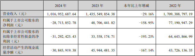 播恩集团2024年年度报告显示,去年,公司实现营业收入10.17亿元,同比减少29.16%;归属于上市公司股东的净利润-2871.39万元,同比减少158.95%;归属于上市公司股东的扣除非经常性损益的净利润-3129.24万元,同比减少193.25%;经营活动产生的现金流量净额-3084.59万元,同比减少167.14%。
