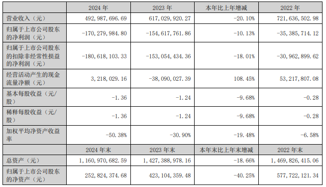 中晟高科2024年年度报告显示,去年,公司实现营业收入4.93亿元,同比减少20.10%;经营活动产生的现金流量净额321.80万元。2022年至2024年3年连亏,归属于上市公司股东的净利润分别为-3538.57万元、-1.55亿元、-1.70亿元;归属于上市公司股东的扣除非经常性损益的净利润分别为-3096.29万元、-1.53亿元、-1.81亿元;