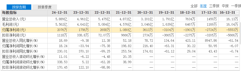 欧林生物2021年至2024年营收分别为4.872亿元、5.475亿元、4.961亿元、5.889亿元;归母净利润分别为1.080亿元、2658万元、1756万元、2076万元;扣非净利润分别为9666万元、72.07万元、338.8万元、1118万元。