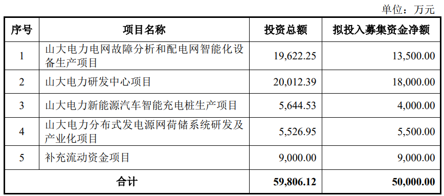 山大电力本次发行募集资金总额59,695.52万元,扣除发行费用后的募集资金净额为52,844.99万元,比原计划多2,844.99万元。公司2025年7月18日披露的招股书显示,公司拟募集资金50,000.00万元,用于山大电力电网故障分析和配电网智能化设备生产项目、山大电力研发中心项目、山大电力新能源汽车智能充电桩生产项目、山大电力分布式发电源网荷储系统研发及产业化项目、补充流动资金项目。