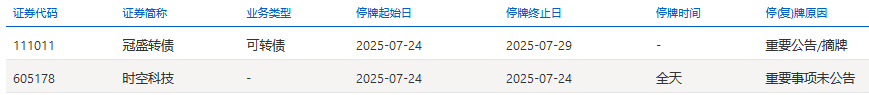 中国经济网北京7月24日讯 上交所网站显示,时空科技(605178.SH)今日全天停牌,停牌原因为重要事项未公告。