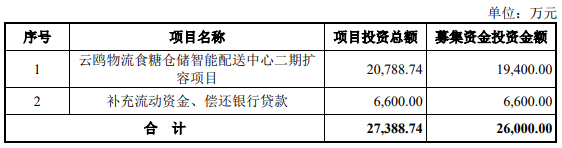 广农糖业于2025年5月16日发布的《2023年度向特定对象发行A股股票募集说明书(申报稿)》显示,本次发行拟募集资金总额不超过26,000.00万元(含本数),扣除发行费用后募集资金净额将全部用于投资以下项目:“云鸥物流食糖仓储智能配送中心二期扩容项目”、“补充流动资金、偿还银行贷款”。