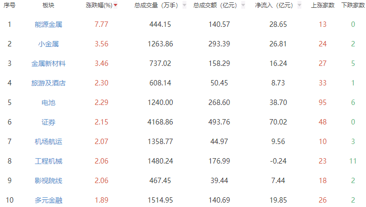 板块方面,能源金属、小金属、金属新材料等板块涨幅居前,贵金属、银行、通信设备等板块跌幅居前。