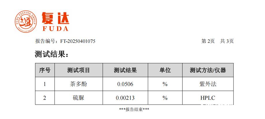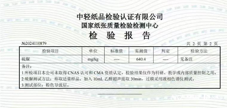 不过值得注意的是,该报告显示,所检项目(即硫脲),检测公司并未取得CNAS认可和CMA资质认定,检测结果仅作为科研、教学或内部质量控制之用。硫脲的测试方法为,称取适量样品,加入10mL乙醇超声提取30min,过膜采用液相色谱仪测试。