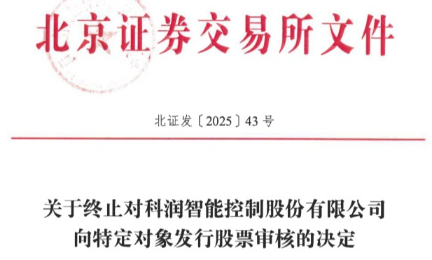 2025年7月16日,科润智控向北交所提交了《科润智能控制股份有限公司关于撤回向特定对象发行股票申请文件的申请》,申请撤回申请文件。根据《北京证券交易所上市公司证券发行上市审核规则》第四十八条的有关规定,北交所决定终止对科润智控向特定对象发行股票的审核。
