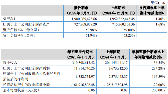 2025年第一季度,科润智控营业收入为3.20亿元,同比增长56.55%;归属于上市公司股东的净利润0.12亿元,同比增长234.28%;归属于上市公司股东的扣除非经常性损益后的净利润0.06亿元,同比增长166.59%;经营活动产生的现金流量净额为-1.62亿元,上年同期为-1.26亿元。