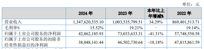 2024年,科润智控营业收入为13.48亿元,同比增长34.29%;归属于上市公司股东的净利润0.43亿元,同比下降41.31%;归属于上市公司股东的扣除非经常性损益后的净利润0.38亿元,同比下降18.18%;经营活动产生的现金流量净额为-1.25亿元。