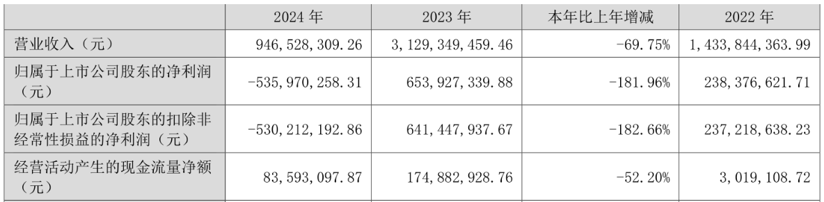 2024年,公司实现营业收入9.47亿元,同比下降69.75%;归属于上市公司股东的净利润为-5.36亿元,上年同期为6.54亿元;归属于上市公司股东的扣非净利润为-5.30亿元,上年同期为6.41亿元;经营活动产生的现金流量净额为8359.31万元,同比下降52.20%。