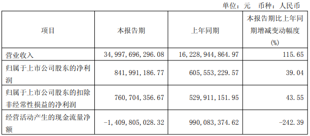 2025年第一季度,华勤技术营业收入为349.98亿元,同比增长115.65%;归属于上市公司股东的净利润为8.42亿元,同比增长39.04%;归属于上市公司股东的扣除非经常性损益的净利润7.61亿元,同比增长43.55%;经营活动产生的现金流量净额-14.10亿元,上年同期为9.90亿元。