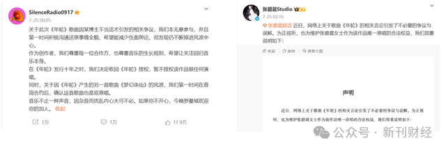 7月25日凌晨,双方工作室相继发声回应。0时5分,汪苏泷工作室发布声明称,自即日起收回《年轮》的演唱授权,并强调《梦幻诛仙》为“双原唱”。2时16分,张碧晨工作室反击指出,《年轮》早在2015年6月15日由张碧晨首发上线,为《花千骨》官方插曲;汪苏泷版本则于6月30日上线,明显滞后,因此张碧晨为“唯一原唱”。当天18时54分,张碧晨方面再次发声,称其依法拥有该歌曲全球范围的永久演唱权,但出于对争议的尊重,决定今后不再演唱该作品。