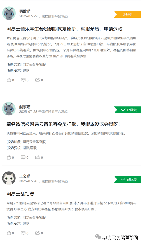 然而,会员收入的增长并未完全转化为用户满意度的提升。据黑猫投诉平台数据,仅近30日内,网易云音乐被投诉逾200次,累计投诉量已达17786件,主要集中在自动续费、扣款无提示、账号绑定不清等问题。例如,有用户反映并未注册网易云账号却遭微信自动扣款;也有学生用户指出,购买5元/月会员后,系统未明确提示有效期,到期即被恢复原价扣费,且售后退款遭拒,令体验“前后不一、答复含糊”。