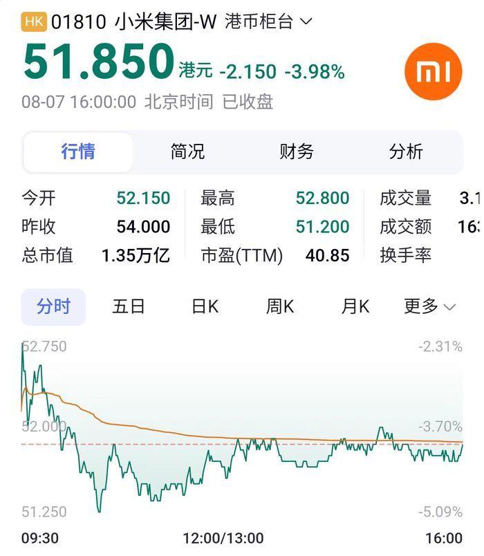 8月7日,小米集团(01810.HK)股价出现明显波动,盘中一度跌超5%,创下6月13日以来新低。