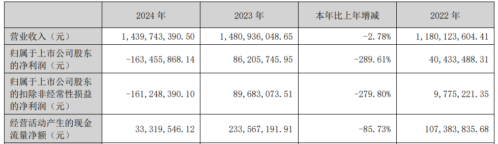 2024年,万兴科技实现营业收入14.40亿元,同比下降2.78%;归属于上市公司股东的净利润为-1.63亿元,上年同期为8620.57万元;归属于上市公司股东的扣非净利润为-1.61亿元,上年同期为8968.31万元;经营活动产生的现金流量净额为3331.95万元,上年同期为2.34亿元。