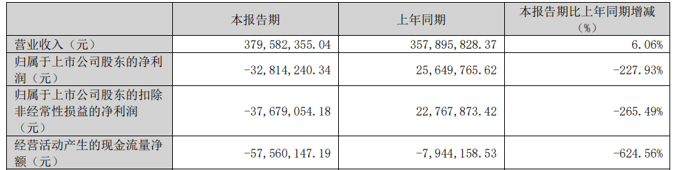 2025年一季度,公司营业收入为3.80亿元,同比增长6.06%;归属于上市公司股东的净利润为-3281.42万元,上年同期为2564.98万元;归属于上市公司股东的扣非净利润为-3767.91万元,上年同期为2276.79万元;经营活动产生的现金流量净额为-5756.01万元,上年同期为-794.42万元。