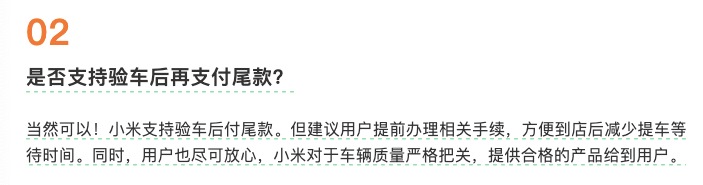 事实上,小米汽车曾对外表态,“支持验车后再支付尾款”。2024年5月1日,小米汽车微信公众号发布的《小米SU7答网友问(第三十四集)》中表示,“小米支持验车后付尾款。但建议用户提前办理相关手续,方便到店后减少提车等待时间。同时,用户也尽可放心,小米对于车辆质量严格把关,提供合格的产品给到用户。”