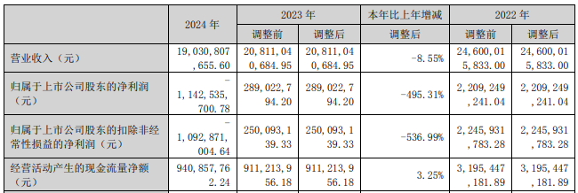 2024年,美锦能源营业收入为190.31亿元,同比下降8.55%;归属于上市公司股东的净利润-11.43亿元,上年同期为2.89亿元;归属于上市公司股东的扣除非经常性损益的净利润-10.93亿元,上年同期为2.50亿元;经营活动产生的现金流量净额为9.41亿元,同比增长3.25%。